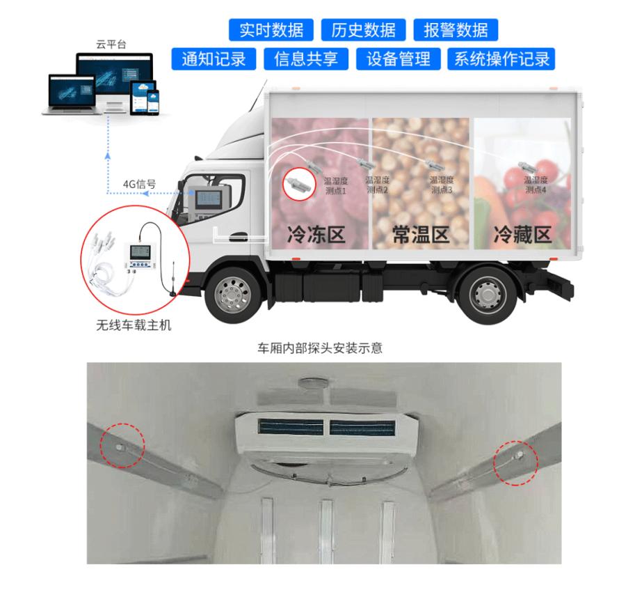 冷藏车温湿度监测系统(有线)由“4G车载多探头温湿度记录仪+环境监控云平台”组成。4G车载温湿度记录仪的探头可灵活布置于车厢内的关键监测点位,实现运输空间的多方位环境参数采集。探头可通过高精度传感器实时监测所在位置的温湿度数据,通过有线传输方式将数据传送至驾驶室内的主机设备,满足不同规格冷藏车的全方位监控需求。主机在接收到数据后,会进一步通过4G网络将数据上传至环境监控云平台,实现数据的远程存储、分析与共享,方便用户随时随地查看运输过程中的温湿度变化。