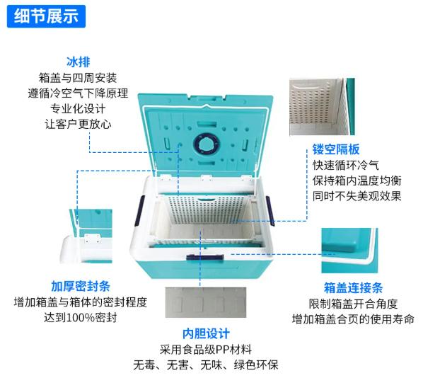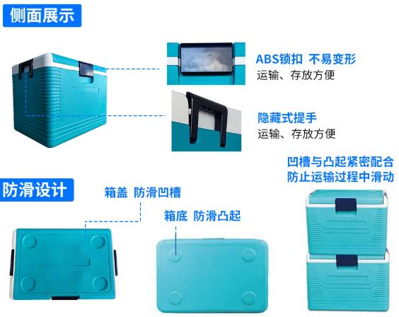保温箱箱体 采用三层复合结构工艺,材料选择上严格遵循安全环保标准,确保无毒无害特性,表面光洁度 符合卫生运输规范。产品兼具高强度结构、持久保温性能及长效使用寿命等突出特点,完全满足温敏物品的严苛运输要求。