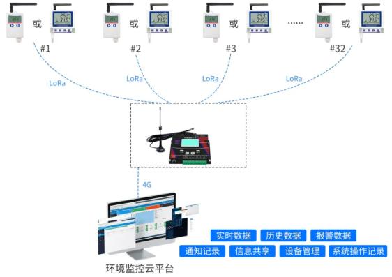 系统通过在冷库内合理布设多个温湿度测点,利用LoRa无线通信技术,将数据实时上传至LORA主机(单个LORA主机可同时连接32个测点),再由主机通过4G网络将数据传送至环境监控平台,实现对库内环境参数的全面采集与集中管理,这种架构设计具有规模化优势,确保了大型冷库实现无死角、全覆盖的温湿度监控。