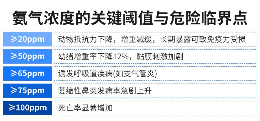 #当长期暴露在高浓度氨气环境下时,不仅会严重损害畜禽的呼吸系统、降低免疫力、影响生长性能,更会增加疾病爆发风险,最终导致养殖效益大幅下滑。对养殖业主而言,氨气同样会刺激眼睛和呼吸道,引发多种并发症,危害职业健康。