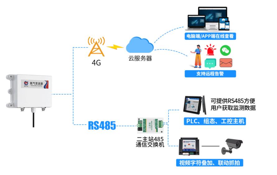 养殖场专用氨气变送器支持4G/RS-485(通信距离最远可达2000米)的传输方式,可无缝接入环境监控云平台或本地平台,对监测数据及设备进行集中监控与管理,传输距离远,可轻松覆盖各种规模的养殖场舍,除此之外,设备也支持模拟量的传输方式。