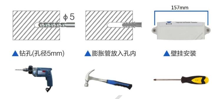 养殖场专用氨气变送器采用壁挂式安装方式,用户预先在墙体上打入直径为5mm的孔后,放入膨胀螺丝,再将设备安装在墙体上并使用螺丝固定即可。
