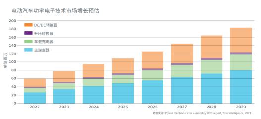 随着电动汽车数量的增加,功率电子技术市场也在整体增长。(数据来源:Power Electronics for e-mobility 2023 report, Yole Intelligence, 2023)