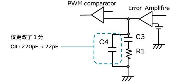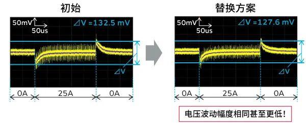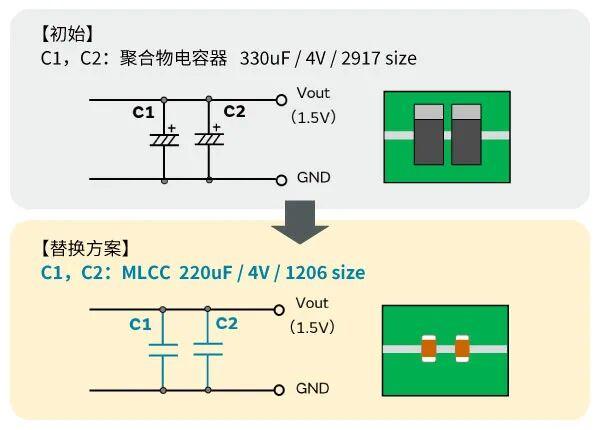 将输出电容器从聚合物电容器替换为MLCC,如下所示。更换时,相位补偿电路常数也会根据电源特性进行调整(图4)。