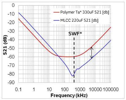 (b)S21曲线:可以看出S21低于聚合物电容器,纹波和尖峰噪声可以进一步降低。