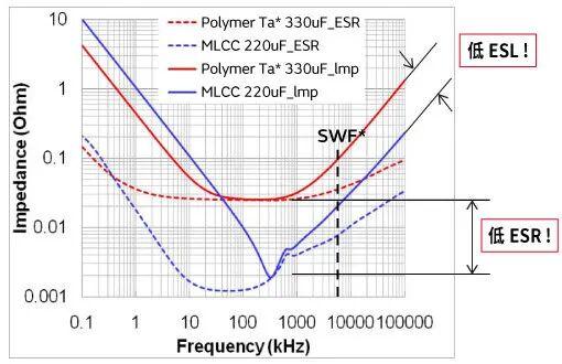 (a)阻抗,ESR与频率的关系。图中的Polymer Ta是聚合物钽电容器,SWF指开关频率。