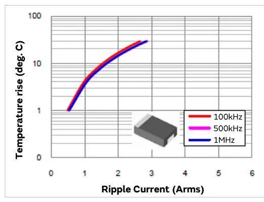(b)MLCC / 1206 size / 100uF。可以看出,MLCC的温升斜率比聚合物电容器的温升斜率更小,因此,使用寿命长,可靠性高。