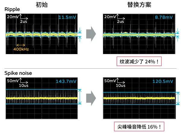 首先,纹波和尖峰噪声显著降低(图1)。与聚合物电容器相比,MLCC具有更低的ESR和ESL,大大降低了输出噪声。