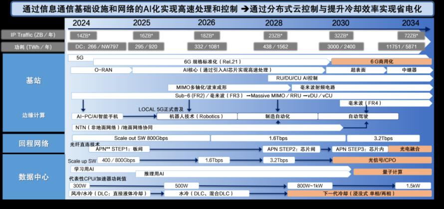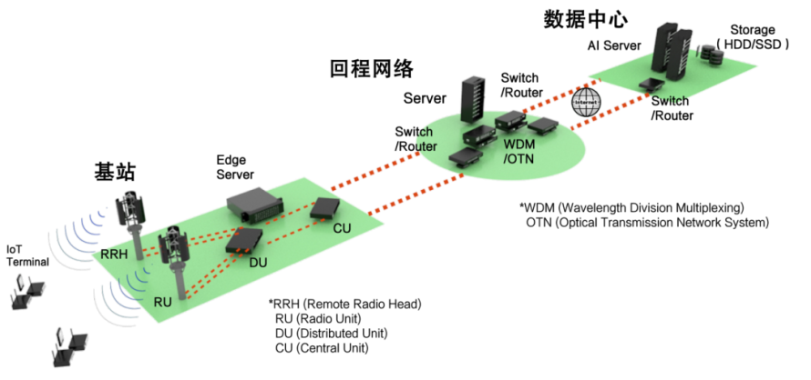 作为信息通信基础设施中承担无线部分的基站,由RRH(Remote Radio Head,远程射频头)、RU(Radio Unit,射频单元)、DU(Distributed Unit,分布式单元)、CU(Central Unit,集中式单元)、边缘服务器等构成。用于中继基站数据的回程网络,会使用交换机、路由器、通信服务器、WDM(Wavelength Division Multiplexing,波分复用)和OTN(Optical Transmission Network System,光传输网络系统)等设备。数据中心则配置有AI服务器、存储器等设备。