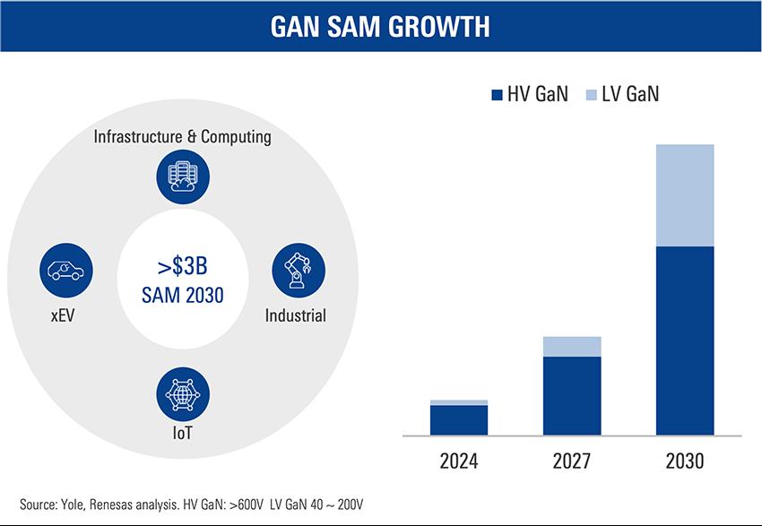 Source: Yole, Renesas analysis. HV GaN: >600V LV GaN 40~200V