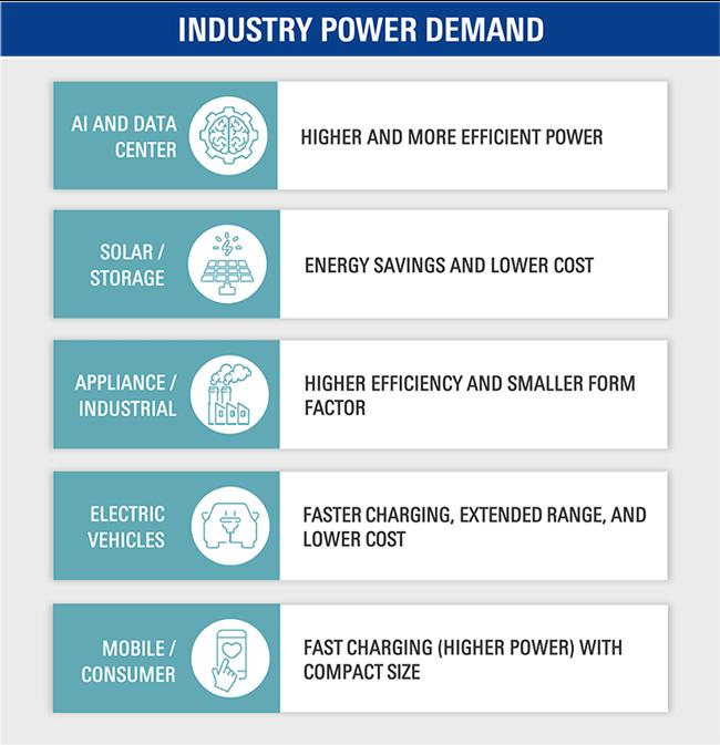 在此背景下,宽禁带半导体材料——特别是氮化镓(GaN)——正脱颖而出:凭借卓越的固有性能优势,其突破硅基与碳化硅(SiC)材料的物理局限。得益于更高的开关频率、更低的导通与开关损耗,以及更优的热管理能力,GaN技术能够实现更加紧凑的电源设计,为高功率密度数据中心机柜中的AI和高性能计算(HPC)工作负载提供支持;并且,其还能减轻电动汽车(EV)车载充电器和DC/DC转换器的重量,从而延长续航里程。此外,GaN还赋能工厂自动化中更高效的电机驱动系统,并助力不间断电源和光伏微逆变器等可再生能源系统,打造高效、紧凑的解决方案。