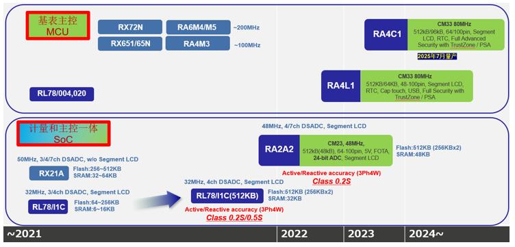 在基表主控 MCU 领域,瑞萨电子 RL78/004 系列曾风靡国网,RL78/020 系列的低功耗工艺与 RL78/004 系列一脉相承,此外还有满足最新电表需求的 RA4L1 和 RA4 下一代新产品。