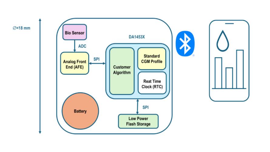 大多数商用CGM系统采用放置在患者皮肤上的电化学安培传感器。这些传感器测量与血糖浓度成比例的小电流,然后由模拟前端(AFE)电路处理并转换为数字信号。该信号由微控制器(MCU)处理,并通过低功耗蓝牙(BLE)传输到医疗读取器。该系统由一次性纽扣电池供电。