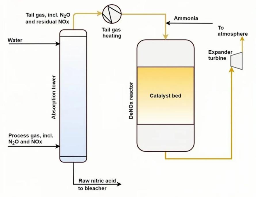 这些气体混合物通常被称为尾气。吸收塔尾气出口的下游安装了一个脱硝反应器,注入氨气在催化剂的帮助下进行氮氧化物还原。