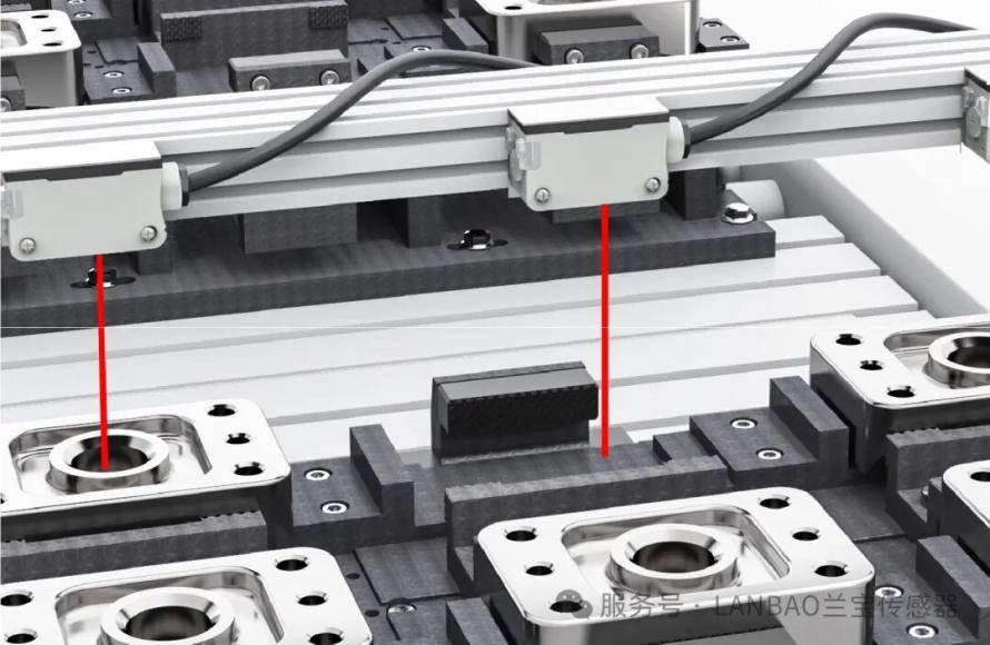 兰宝LE40系列电感式传感器广泛用于积放链输送线,通过检测滑橇和车体的到位状态实现分轨控制,可灵活安装于有限空间,并通过无金属区域设计减少干扰。