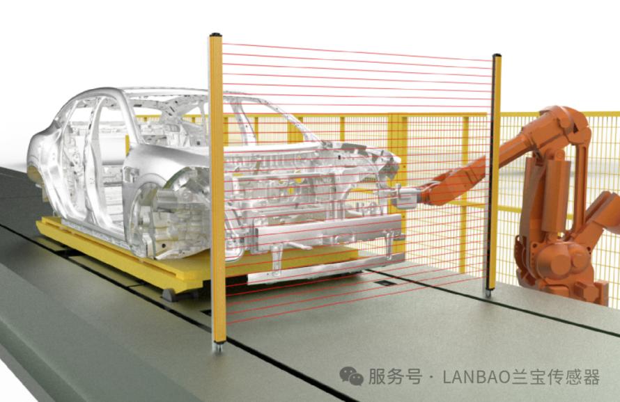 兰宝SFS系列安全光幕通过投光器发射红外光形成保护网,当焊接入口区域有如人员肢体、工具等遮挡光束时,受光器会立即触发信号,在毫秒级时间内切断设备动力系统,强制停机以避免伤害。这种快速响应能力尤其适用于焊接等高危环节,可有效防止误入危险区域导致的事故。