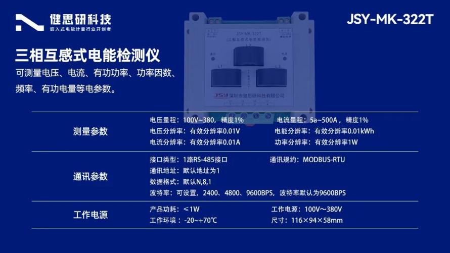 2路RS-485接口支持Modbus-RTU协议,下行可连接16台JSY-MK-322T;