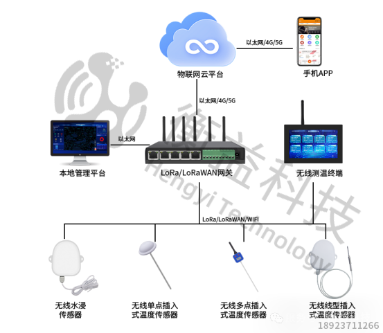 无线测温终端接口丰富,对内支持无线(LoRa/LoRaWAN),有线RS485,I/O,可以连接多种有线无线传感器,可以跟各种不同的传感器组成一个小系统。对外支持4G/5G,RJ45,能把接收到的传感器数据上传到云平台。也可以通过I/O联动外部的控制设备。下面是无线测温终端组成一些系统。