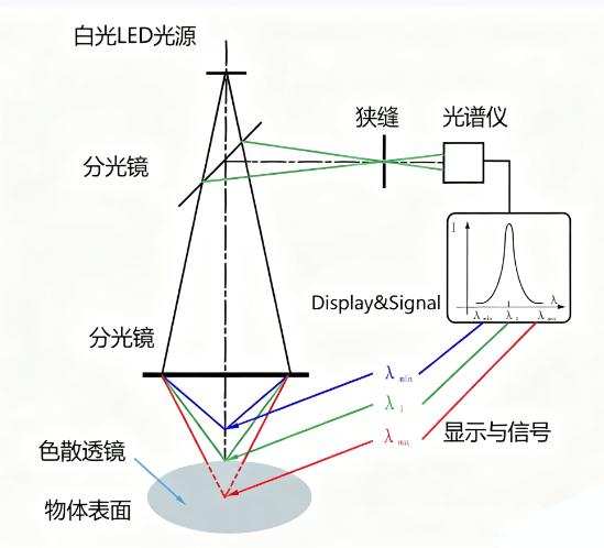 利用特殊透镜的色差,将不同波长( λ)的光聚焦在光轴上的不同位置,形成一把由颜色编码的“光学尺”;测量时,只有物体表面所在位置对应的特定波长光能被精确聚焦并反射,系统通过分析反射光中的峰值波长,即可根据预先标定的波长-距离关系,直接、精确地计算出物体的距离或高度。