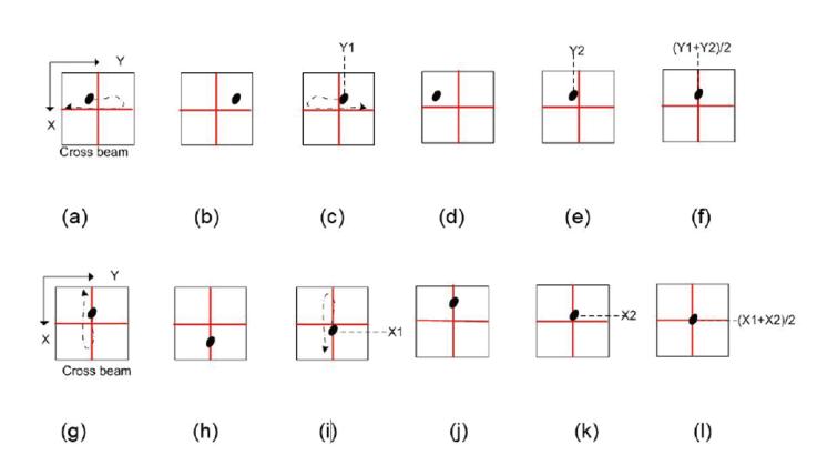 通过两条对射光路构成一个二维坐标体系XY。机器人或XYZ平台移动待校准针头在激光对针传感器的中心附近搜索,接着引导待校准物沿着Y方向从右向左移动,当待校准物第一次接触到激光束时,标记为Y1,当待校准物刚离开时的位置标记为Y2,Y方向的中心位置即为(Y1+Y2)/2的坐标,同理可找X轴的中心位置;在定位XY的中心点后,将针头移动到中心点位置,向上提起针头,当出现两个激光束同时消失,即为Z轴零点,结合以上即可确定针尖的空间零点。