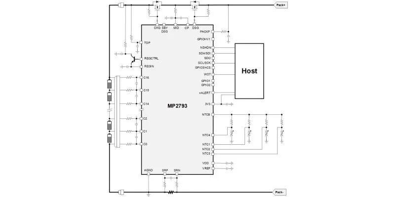MP2793 具有高达 50mA 的内部电池均衡功能,支持 7 - 16 节电池包监测及全方位保护,支持 FET 软启动放电控制以消除预充电电路,其双 ADC 架构可实现严格同步的电流/电压测量,用于测量阻抗。MP2793 可与MP4278X 配合使用,后者可兼容任何 AFE 实现精准的电量预估,支持 2s 到 16s 电芯(最高支持 112s 版本),可对每节电芯实现 SOC计算以及整个 PACK SOC 计算,提升 SOH、SOC、峰值功率、电池内阻的估算精度。