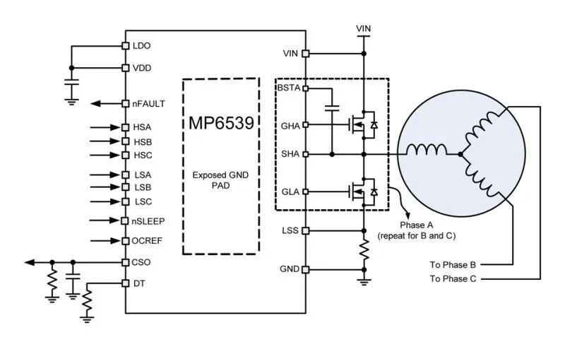 MP6539 专为三相无刷直流电机驱动器应用设计,能够驱动由六个 100V N-通道功率 MOSFET 组成的三个半桥。它支持 100V 工作电压、120V VBST 最大电压,具备 0.8A/1A 驱动和灌电流能力;支持电池供电应用的低功率休眠模式,Isleep 休眠电流 ≤1μA;拥有可调节的死区时间控制、可编程过流保护(OCP)、故障指示输出等关键功能;提供 TSSOP-28(9.7mmx6.4mm)和QFN-28(4mmx5mm)两种封装形式可供选择。