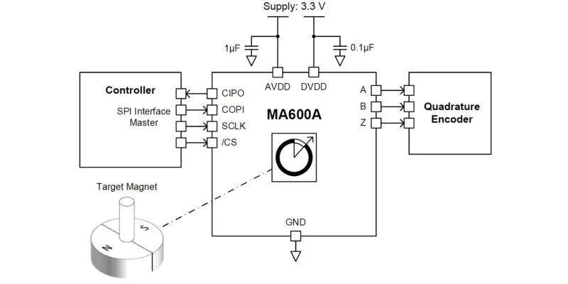 MA600A 是一款高精度、高带宽的 TMR 磁角度传感器,可助力驱动电机精准检测角度和位置。该器件经过工厂校准,在全温工作范围内误差(INL)低于 0.6°,若使用片上 32 点查找表进行用户校准后,误差可小于 0.1°。MA600A 支持多种磁场强度和装配方式,包括轴端(同轴)和侧轴(离轴)安装,可通过串行外设接口(SPI)和同步串行接口(SSI)进行通信,并支持菊花链配置。该器件采用超小型 QFN - 16(3mmx3mm)封装。