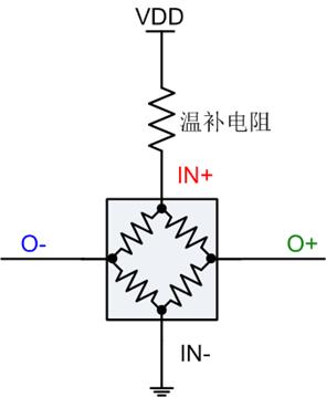 以微熔芯体为例,由于微熔芯体激励方式是恒压激励,微熔芯体上的应变片阻值一般呈正温度系数,而输出尤其是满量程输出呈负温度系数,由以上特点,在变送器的激励端串一个低温度系数的电阻,通过分压的方式,可以实现温补。温补电阻串联位置见下图。