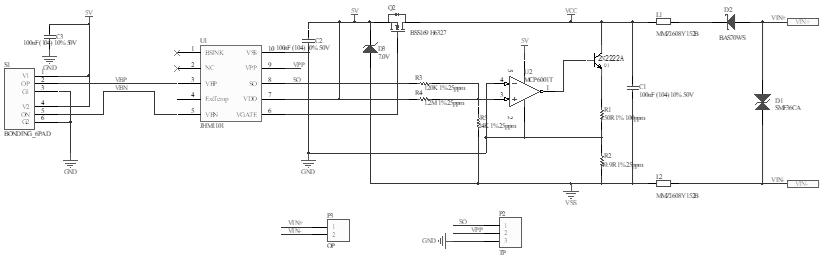 2、使用JHM1101的外部测温功能,将测温二极管贴近微熔芯体的金属结构件放置,降低电路元件的温升带来的测温偏差,进而降低电路元件对变送器温补精度的影响。